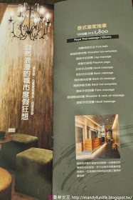雖然是來放鬆的,But...職業病如我還是忍不住拿出相機拍了起來,哈哈~ 在等待的時間,和櫃檯小姐借了 Menu 來看一下~ 將將~ 我今天選擇的SPA項目就是這個整整放鬆 120分鐘的「泰式皇家推拿」。